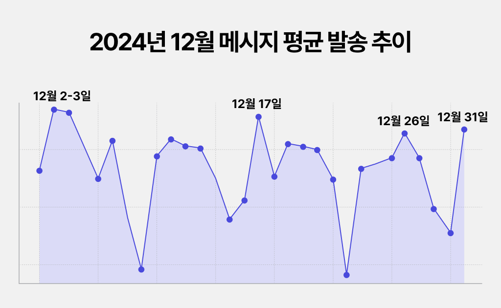 흥미로운 지점은 12월 26일입니다. 크리스마스 당일인 25일보다 오히려 이 시점에 발송량이 급증하는 모습을 확인할 수 있습니다. 25일에는 기업들의 휴무로 발송이 다소 줄어들고, 26일부터는 연말 공지, 정산 안내, 새해 일정 공유 등이 한꺼번에 재개되기 때문으로 보입니다. 송년 인사 메시지 역시 크리스마스 직후인 26일 전후에 연말 안내와 함께 묶어서 발송하는 전략을 검토해 보는 것도 좋은 방법으로 보입니다.