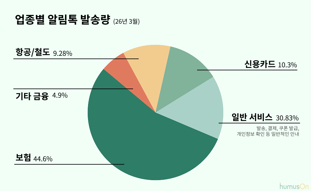 고객에게 자주 안내해야 하는 업종이 알림톡을 자주 사용합니다. 단일 업종으로 알림톡을 가장 많이 보내는 업종은 보험입니다. 전체 메시지의 46.84%가 이들이 보낸 메시지입니다. 발송량 기준으로는 44.6%입니다. 신용카드와 기타 금융을 포함하면 전체 알림톡 발송량의 64.97%가 금융업에서 보냈습니다.