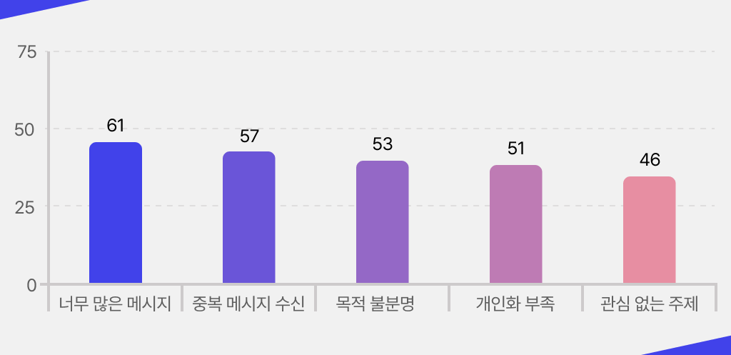 조사에 따르면 3회 이상 빈번한 메시지 발송을 선호하는 소비자는 단 6%에 불과합니다. 즉, 지나친 발송은 피로감을 높이고 결국 수신 거부로 이어질 가능성이 크다는 뜻이죠.